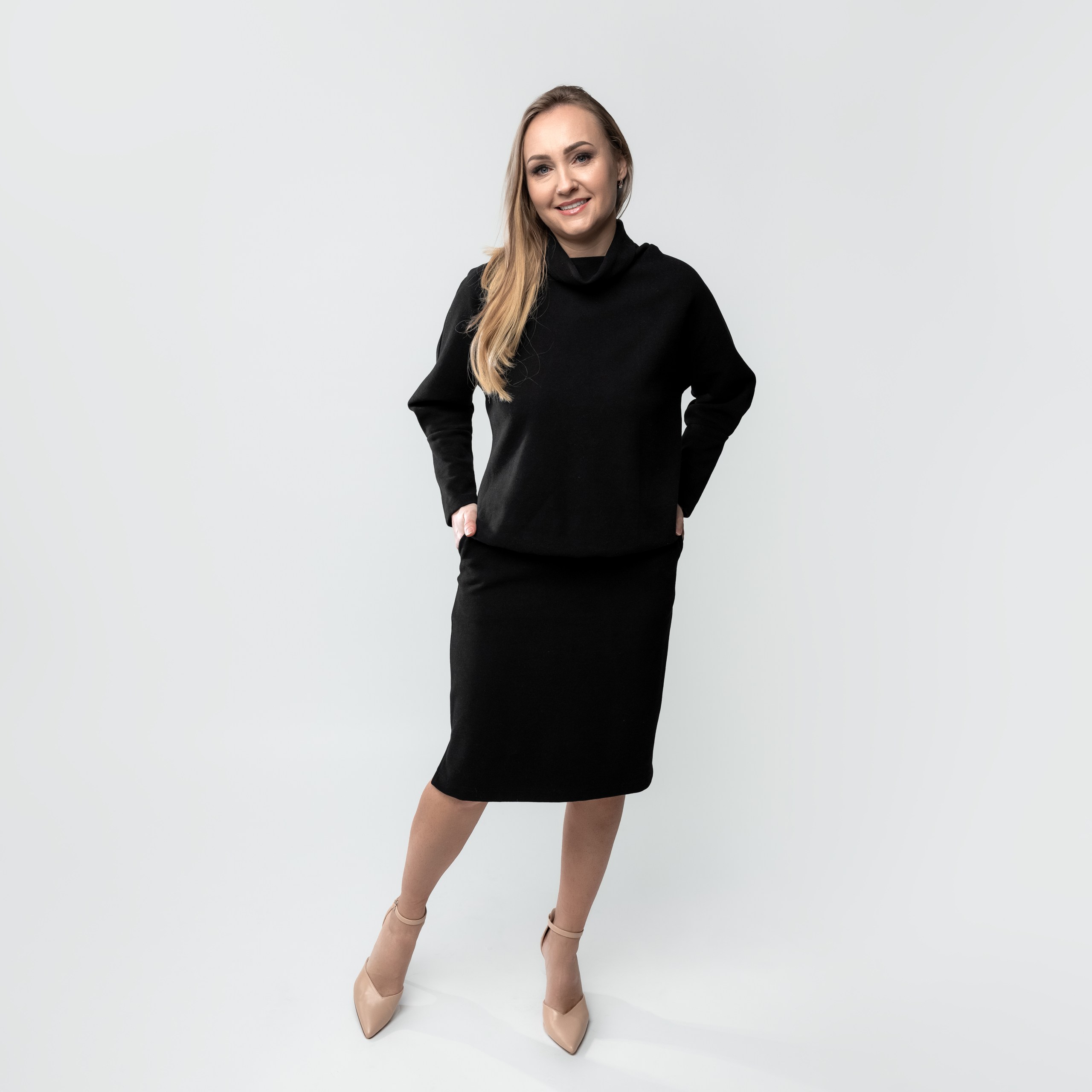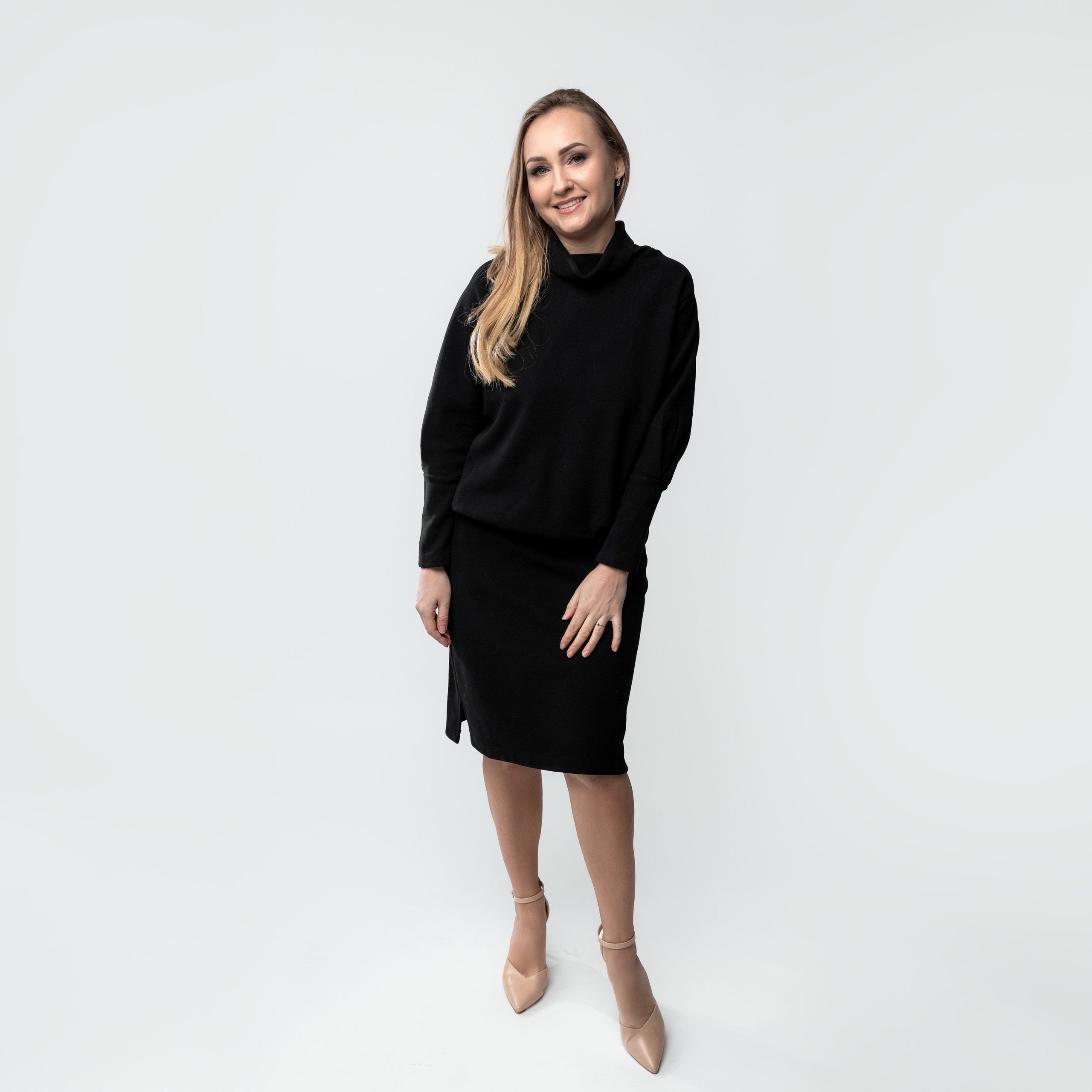 Elegantiškas moteriškas kostiumėlis, sukurtas derinti komfortą ir stilių. Sijono modelis išlaiko solidų, elegantiška įvaizdį ir puikiai tinka tiek darbui, tiek laisvalaikiui. Viršutinė dalis- kimomo stiliaus, ilgomis rankovėmis, subtiliai krintanti ant kūno ir suteikianti laisvą siluetą. Aukšas kaklas-  suteikia papildomos šilumos.